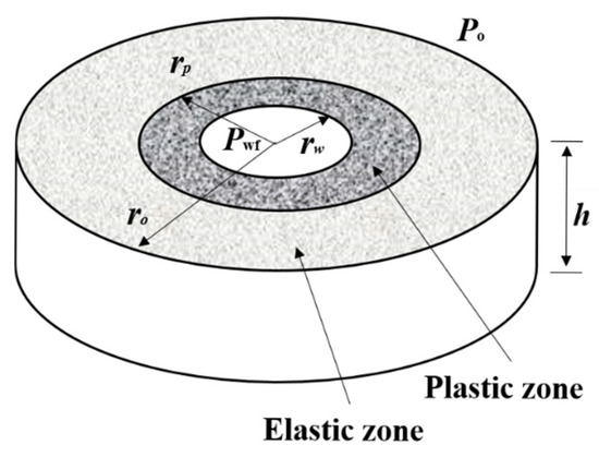 The so-called sand production radius refers to the radius of the plastic zone near the wellbore. It is the maximum theoretical radius around a wellbore within which the in situ stresses exceed the formation’s strength, leading to rock failure and the potential for sand production. It represents the boundary between the failed, yielded zone (where sand is dislodged) and the intact, stable formation. Before sand production, elastic deformation occurs in the whole formation. After sand production, plastic failure occurs in the region around the wellbore. The whole formation is divided into the plastic area and elastic area shown in Figure 16.