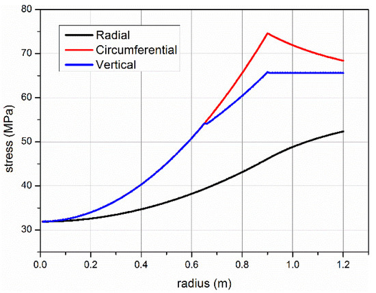 In this paper, we mainly discussed the effects of TSS extrusion force on the plastic region, so a detailed discussion of elastic and plastic solutions of formation is beyond the scope of this article. The effects of TSS extrusion force are simplified to an external force applied to the wellbore wall. Given the internal and external boundary conditions, namely the wellbore radius , bottom effective internal pressure , external boundary radius , and external boundary pressure , the elastic–plastic stress distribution of the formation near the well can be calculated.