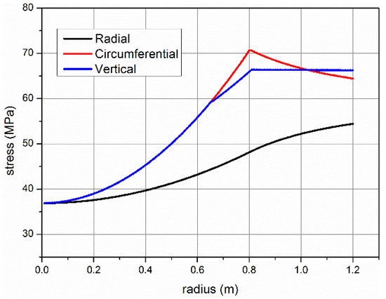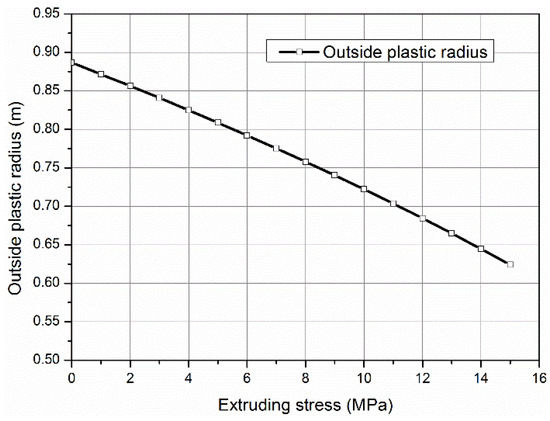 Figure 17 and Figure 18 compare and analyze the plastic stress distribution under the influence of the TSS. The formation stress increases along the radial direction from the wellbore wall, the vertical stress and circumferential stress coincide in the internal plastic area, separate after exceeding the first plastic area, and the formation stress begins to change slowly at the boundary of elastic–plastic stress. If there are no TSS effects, as shown in Figure 17, the plastic radius is about 0.9 m. When the TSS extruding stress is 5 MPa, the elastic–plastic contact radius is obviously reduced from 0.9 m to 0.81 m. If the expansion performance and the stiffness of TSS materials are further improved, the strengthening effect of the wellbore wall will be greatly increased. Figure 19 shows the variation range of the plastic radius calculated after further improving the extruding stress of the TSS. Obviously, the external plastic radius decreases with the increase in expansion extruding stress.