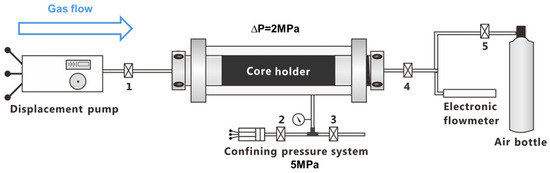 After imbibition, cores were mounted in a core holder under a confining pressure of 5 MPa. Gas-driven flowback was performed using high-purity N2 at a constant upstream displacement pressure of 2 MPa, corresponding to effective volumetric flow rates on the order of 10−2–10−1 mL/min over the tested permeability range. The produced liquid was collected and weighed periodically, and flowback was regarded as stabilized when the incremental liquid production was <0.1% of the initial imbibed water over 2 h. The reported flowback efficiencies and permeability regain were calculated at this stabilized state.