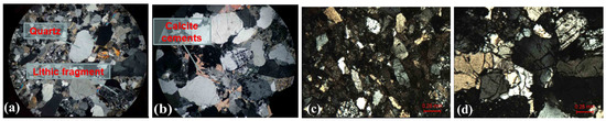 Identification of the thin sections of Tarim Basin rocks. (a) Quartz and lithic fragment in rock samples; (b,c) mid-fine sand-like structure with a slightly directional arrangement of lithic fragments; (d) coarse sand-like structure.
