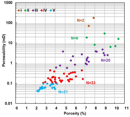 Evaluating and predicting high-quality intervals is central to reservoir assessment in tight oil and gas plays. Because there is no universally accepted scheme, published classification references for sandstone reservoirs vary widely, hampering lateral correlation and comparison. Guided by the Classification of Gas Reservoirs of Reservoir Physical Properties (SY/T 6168-1995) [25] and the measured porosity–permeability trend of the Tarim Basin core set (Figure 4), a five-category reference for sandstone gas reservoirs was proposed (Table 4). To ensure cross-figure consistency, a single, color-blind-safe symbol–color mapping is fixed for reservoir Types I–V and reused it in all figures. Types I–V are differentiated by permeability/porosity bands together with pore-throat metrics from MICP (maximum and median throat radii, mean throat radius, and sorting coefficient) and typical lithology. In this framework, Types I–II represent relatively better-sorted, larger-throat systems (conglomeratic to gravelly coarse/medium sandstone), whereas Type V reflects fine-sandstone fabric with smaller, more poorly sorted throats. This practical scheme provides a consistent basis for lateral correlation and subsequent engineering screening.