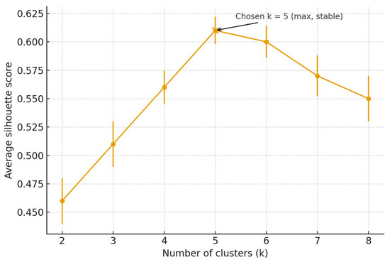 As shown in Figure 6, the average silhouette increased from k = 2 to k = 5 and reached a maximum at k = 5 (mean 0.61 ± 0.012), followed by a decline at k ≥ 6 (mean 0.60 ± 0.014). The improvement from k = 4 to k = 5 exceeded one standard deviation, whereas further splitting (k ≥ 6) yielded lower silhouettes and less balanced clusters. Therefore, k = 5 was selected as the optimal and parsimonious solution, which also aligns with the five-tier permeability taxonomy used in sandstone reservoir engineering (SY/T 6168-1995) and the observed porosity–permeability trend of our Tarim Basin cores. The close agreement between the clustering outcome and the artificial scheme demonstrates that the proposed classification is both statistically supported and operationally simple. In the following sections, Types I–III were focused on as the primary targets for exploration and development (Figure 5; Table 5).