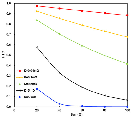 The phase trapping degree reservoir is closely related to reservoir physical properties, intrusive fluid properties and backflow pressure difference. As mentioned above, according to classification reference of tight sandstone reservoirs, dividing reservoir rocks into five categories. Taking Tarim Basin as an example, the degree of damage of aqueous-phase trapping of different rock classes under a 10 MPa pressure difference is predicted. Figure 6 shows that under a fixed pressure difference, the degree of water-trapping damage decreases with the increase in permeability and initial water saturation. The PTC values of Type I and Type II are basically less than 0.3, which indicates there will not be any phase trapping damage in Type I and Type II reservoirs, so the rocks of Type I and Type II are not the focus of the experimental study in this paper. When reservoirs belong to Type IV and Type V, the PTC are all greater than 0.7, which shows intense phase trapping damage. The Type III PTC are much more extensive, ranging from weak to intense phase trapping damage.