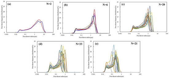 Relation of pore-throat frequency distribution and pore-throat radius of five categories. (a) Type I; (b) Type II; (c) Type III; (d) Type IV; (e) Type V.