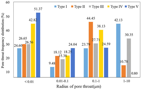 Frequency distribution of pore-throat in different pore-throat diameter range of five categories.