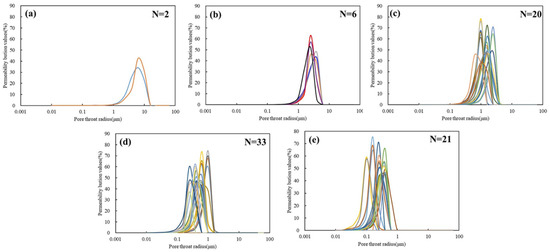 Relation of permeability distribution values and pore-throat radius of five categories. (a) Type I; (b) Type II; (c) Type III; (d) Type IV; (e) Type V.