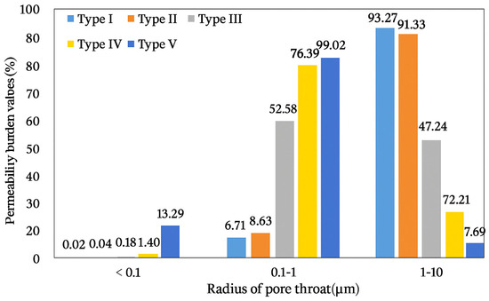 Permeability distribution values in different pore-throat diameter range of five categories.