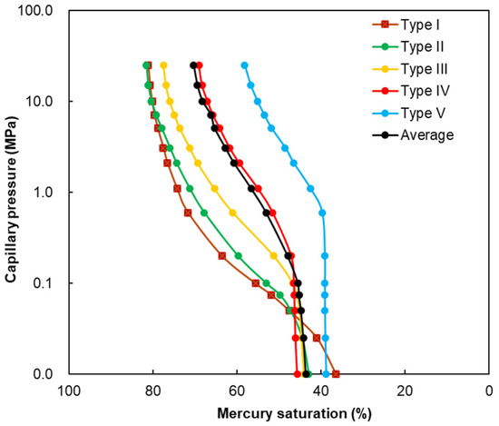 Average mercury intrusion curves of each category and the total.