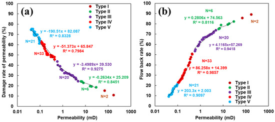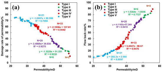 (a) The relationship between the permeability damage rate and the permeability of tight sandstone; (b) the relationship between the flowback rate and the permeability of reservoir of tight sandstone.
