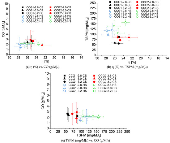 Regarding the plot between η and TSPM shown in Figure 2b, it is worth noting that lower particle emissions were achieved under cold start conditions for both combustion chambers. The average TSPM emission at cold start was 74.11 mg/MJd; at hot start, it was 122.70 mg/MJd, representing an increment of ~66%. The high TSPM emissions under hot start are attributed to a high formation of tars, which promotes TSPM formation. Tars are produced due to the high biomass-to-air equivalence ratio reached at hot start, as well as other factors, such as the tar cracked by chemically activated carbon, which alters the composition of the producer gas and leads to the formation of soot during pyrolysis [16].
