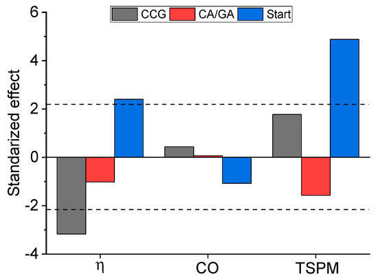 Figure 2 shows the relation between thermal efficiency and specific emissions of CO and TSPM from the improved biomass cookstove under the modified WBT protocol. The answer variables have been studied as a function of the experimental factors, such as combustion chamber design, CA/GA ratio, and start type of WBT. Figure 3 illustrates the statistical significance using a Pareto chart with a 95% confidence level for each analyzed answer variable (η, CO, and TSPM). The experimental factor CA/GA did not statistically affect any answer variables assessed here (Figure 3). This result was attributed to the slight variations in the CA/GA ratio (2.8, 3.0, and 3.2) tested, as well as to the constant flow rate of the gasification air during the experimental campaign (GA = 146 L/min). Therefore, the flow rate and flow conditions of CA are similar for the experimental plan; consequently, the variation of η, CO, and TSPM as a function of CA/GA was not significant due to the mild variation observed in these parameters.