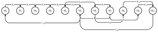 The traffic early-warning information evolution model, based on the SPN structure, contains 11 reachable states denoted as M0, M1, …, M10. During the modeling process, a continuous-time SPN can be transformed into a Markov chain through state mapping, where each SPN marking corresponds to a state in the Markov chain. The reachability graph of the SPN is isomorphic to the state space of the Markov chain.