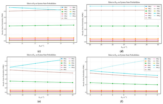 The stable probability of each state under variations of different transition rates: (a) λ2—data preprocessing rate; (b) λ3—data entering the warning system rate; (c) λ9—system judged as no-warning rate; (d) λ10—red warning handling rate; (e) λ11—orange warning handling rate; (f) λ12—warning information review rate.