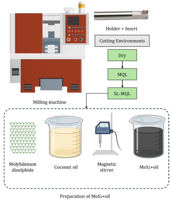 Three distinct environmental conditions were employed to study the machinability of the fabricated LPBF-AlSi10Mg and to evaluate its performance. No external coolant or lubrication setup is employed for dry cutting. Although dry machining is environmentally friendly, it leads to increased cutting temperature and wear. Castor oil was used as the lubricant for MQL, and an MQL setup was utilized to spray the oil in small droplets close to the cutting area. Castor oil lowers cutting temperatures, improves surface smoothness, and lessens the friction at the tool–W/p contact due to its greater lubricating qualities and biodegradability. SL-MQL involved adding MoS2 to the castor oil in the MQL system. MoS2 was introduced in fine particulate form (size ~2 µm) and a density of 4.7–4.8 g/cm3 to enhance the lubricating properties of the oil. In this study, 2 wt% of MoS2 was added to castor oil. This level balances atomization quality, dispersion stability, and tribological effectiveness. MoS2 is renowned for its superior anti-friction qualities, which considerably lower the coefficient of friction. These properties make it highly effective in reducing tool wear and improving the machinability of alloys.