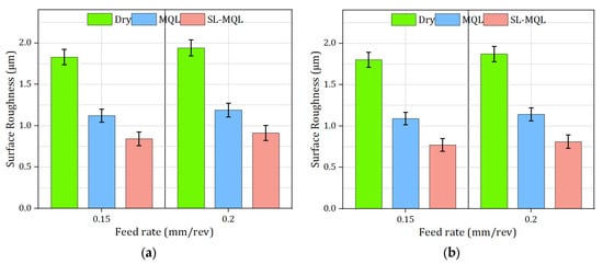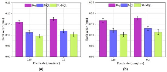 The Vc, fr, and lubrication all have a major impact on the amount of Vb, which is an essential component in determining the durability of a tool and the performance of its machining capabilities. Figure 6a,b presents the variation in Ra under distinct cutting strategies. Elevated friction and heat generation at the tool–W/p junction are caused by the absence of lubrication under dry conditions []. This leads to faster wear at the cutting edge. Due to increased cutting forces and longer tool–W/p contact, the Vb increased when the fr increased from 0.15 mm/rev to 0.2 mm/rev. In dry cutting, Vb values were the highest for both Vcs (45 m/min and 60 m/min). At 45 m/min, Vb reached 0.161 mm at the lower fr and 0.174 mm at the higher fr, while at 60 m/min, these values increased to 0.168 mm and 0.179 mm, respectively, demonstrating the increased mechanical and thermal stresses with higher Vcs. When MQL was introduced, it formed a lubricating lining that decreased heat generation and friction, and greatly improved the tool’s performance. Under MQL, Vb decreased across all conditions when compared to dry cutting, showing measurements of 0.113–0.122 mm at the lower fr and 0.120–0.131 mm at the higher fr. L/C through SL-MQL delivered even better wear resistance, accomplishing the lowest Vb measures of 0.096–0.103 mm at the lower fr and 0.105–0.114 mm at the higher fr across both Vcs. Wear mechanisms were mitigated by SL-MQL’s improved lubricating qualities and increased thermal conductivity, which decreased friction, lowered chip adherence to the tool, and more efficiently dissipated heat. Furthermore, SL-MQL continued to operate well regardless of Vc and fr, demonstrating its capacity to regulate mechanical and thermal stresses to improve cutting conditions and prolong tool life [].