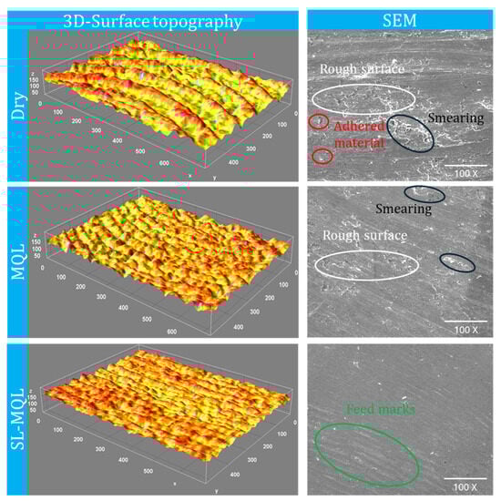 Figure 5 presents the 3D surface topography and SEM image of the LPBF-AlSi10Mg milled under distinct coolant conditions. Due to irregular material removal and thermal distortion, dry cutting caused significant friction and higher temperatures, which resulted in noticeable peaks and valleys on the milled surface. A rough surface with smearing and adherent material was seen in the SEM image under dry conditions. This was because of localized material softening and redeposition caused by inadequate chip evacuation and cooling. MQL conditions decreased friction and enhanced cooling. However, the milled surface retained some roughness, since the heat dissipation was not enough to completely remove smearing. In addition, the 3D topography showed reduced peaks and valleys in relation to the dry cutting strategy. With MoS2 as a solid lubricant, SL-MQL offered better thermal management and lubrication, reducing friction and efficiently dispersing heat. Because of this, the material was removed uniformly, leaving a smooth surface with only a few feed marks on the machined surface. This is a sign of stable cutting dynamics and fewer interactions with adhesive at the tool–W/p junction.