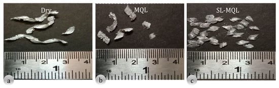 Chip structure: (a) dry, (b) MQL, and (c) SL-MQL at Vc = 60 m/min and fr = 0.2 mm/rev.