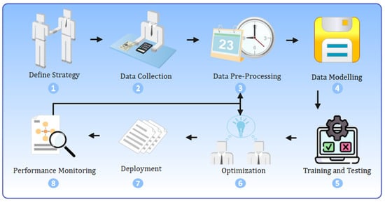 Computers can learn from data and make decisions without explicit programming thanks to ML. Because the computer recognizes trends and improves with time, it is a crucial technique for automating difficult tasks []. Machine learning drives smart factories in Industry 4.0 by improving quality control, identifying when equipment may break down, and streamlining processes. It allows for customized production while also streamlining supply chains and decreasing waste. ML aids industries in becoming more effective, sustainable, and flexible through the analysis of data from interconnected systems []. The workflow for ML is presented in Figure 9.