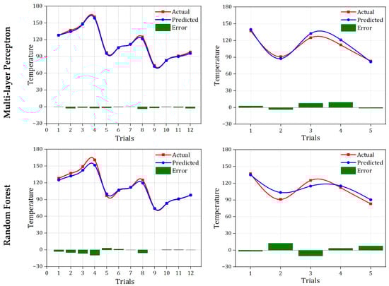 - MLP continuously excelled in all metrics in relation to other algorithms, attaining excellent accuracy and low error rates during the training and testing stages. Although RF and GPR demonstrated competitive training outcomes, they struggled significantly in the testing stage. Since bagging lagged considerably when compared to other models, MLP turned out to be the best model in this investigation for Vb, Ra, and temperature.
