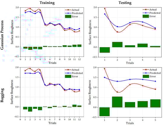 Prediction was performed for three outcomes, i.e., Tc, Ra, and Vb, using four ML algorithms, GPR, Bagging, MLP, and RF. The dataset was partitioned into 80% for training and 20% for testing, and model performance was evaluated on both sets to assess learning quality. Figure 11, Figure 12 and Figure 13 present the Prediction of Training and Testing of distinct ML models for Tc, Ra, and Vb, respectively. With a substantially lower error than the other algorithms, MLP distinguished itself from others by consistently generating predictions that were closer to the measured values for every outcome. MLP performs better due to its design and capacity to model complicated and non-linear interactions. MLP uses layers with interconnected neurons to learn data and relationships. By using the activation function (ReLU), MLP is able to identify complex correlations that may be missed by other approaches. Furthermore, because MLP continuously modifies the weights of its connections during its training period to minimize error, it can handle a variety of datasets with efficiency. On the other hand, algorithms such as Bagging and RF, although resistant to overfitting, depend on combining simpler models (decision trees), which may ignore more complex, non-linear interactions. Similar to this, GPR can have trouble with multidimensional datasets. These variations show why MLP performed so well during this investigation, proving its ability to produce remarkably accurate predictions for all possible outcomes.