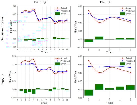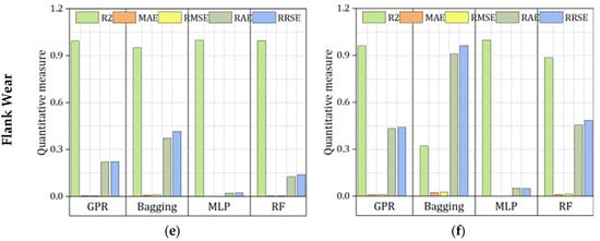 The performance of four ML models (GPR, Bagging, MLP, and RF) was evaluated for Tc, Ra, and Vb prediction using training and testing datasets. The metrics employed for the evaluation are correlation coefficient (R2), mean absolute error (MAE), root mean squared error (RMSE), relative absolute error (RAE), and root relative squared error (RRSE). The measure of R2 should be between 0 and 1; if the R2 measure is closer to 1, the prediction is perfect. The reverse is true for MAE, RMSE, RAE, and RRSE. Figure 14 presents the quantitative measure (Figure 14a,b) training and testing for Tc, (Figure 14c,d) training and testing for Ra, and (Figure 14e,f) training and testing for Vb. In this research work, 5-fold cross validation was performed to validate the model’s capacity. For Tc, MLP demonstrated strong predictive agreement, yielding an R2 of 0.9803. Error magnitudes were low, with an MAE of 5.1529 and an RMSE of 5.8211, corresponding to relative errors of 22.03% (RAE) and 20.69% (RRSE). Across folds, for Ra, MLP delivered the most accurate predictions, with the lowest absolute and relative errors (MAE 0.063, RMSE 0.0759; RAE 15.28%, RRSE 16.42%) and a high correlation coefficient (R2 = 0.9924). For Vb, MLP also tracked the targets very closely, with an R2 of 0.9964. The errors were small—MAE 0.0023 and RMSE 0.003—which translate to relative errors of 8.50% (RAE) and 9.84% (RRSE).