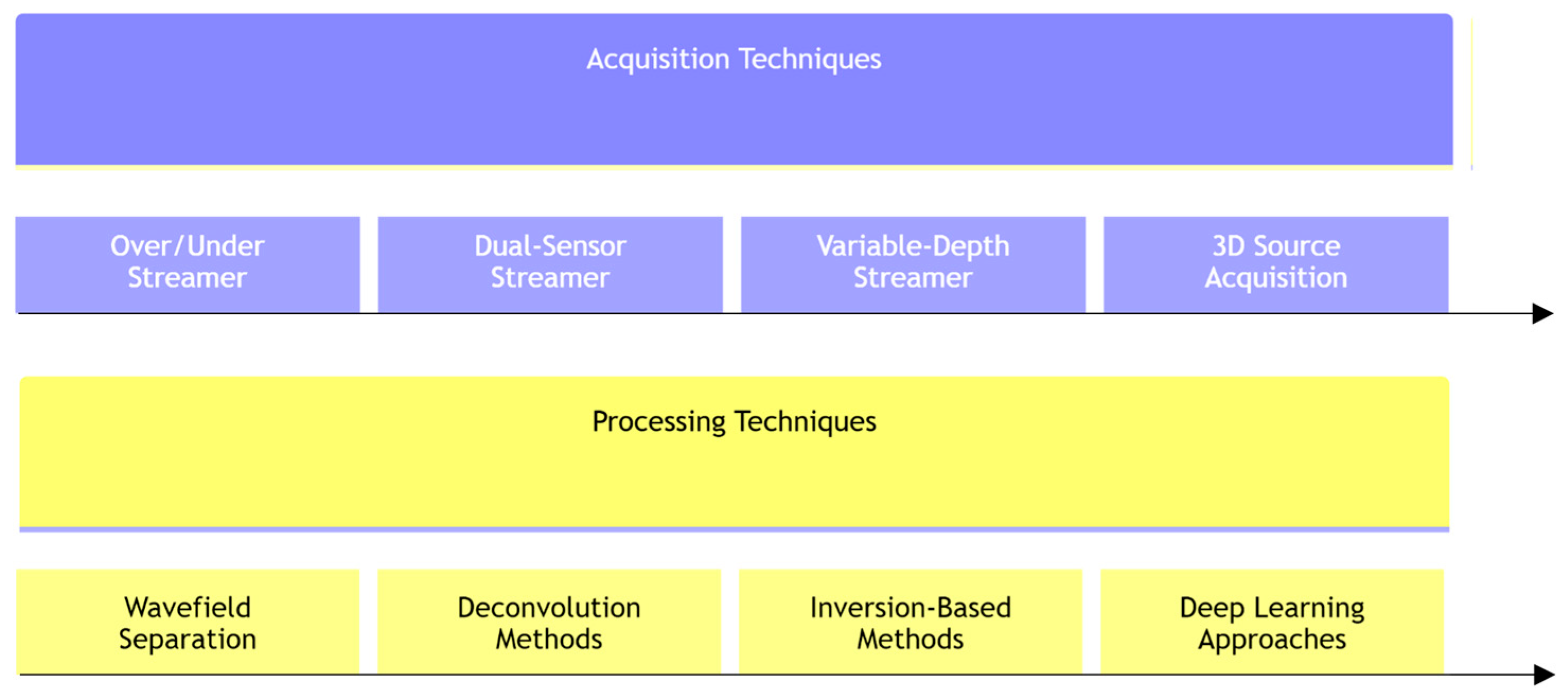 At present, geophysicists, both at home and abroad, have conducted in-depth research on two aspects: the offshore seismic acquisition method and the seismic data processing method (Figure 1). Firstly, in the field acquisition process, appropriate source combinations, cable shapes, or cable combinations are adopted to reduce the influence of ghost waves; secondly, in the data processing stage, appropriate algorithms are used to eliminate ghost waves from the measured data [18].