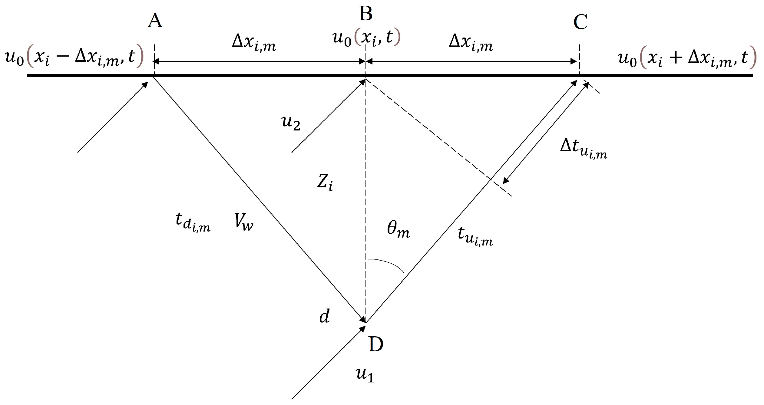 Figure 2. The relationship between the total wavefield recorded by the cable-dragging seismic data and the upward-reflected wavefield of the seabed strata. Point B: A virtual reference point that is located at the sea surface directly above the actual receiver D. The upgoing wavefield at this point, denoted as u 0 x i , t , serves as our primary unknown. Point D: The actual receiver location at depth zi, where the total wavefield a x i , t   is recorded. Point C: A virtual source point for the direct arrival. It is located at the same depth as D, but positioned as such that the ray from C to D represents the path of the upgoing wave arriving at receiver D at time t. The horizontal offset from B to C is x i , m . Point A: A virtual source point for the ghost arrival. It is located at the same depth as D, but positioned as such that the ray from A to D (via reflection at the sea surface above B) represents the path of the ghost wave. The horizontal offset from B to A is x i , m . t u i , m : The travel–time difference for the upgoing wave from point C to point D. t d i , m : The travel–time difference for the ghost wave from point A to point D.