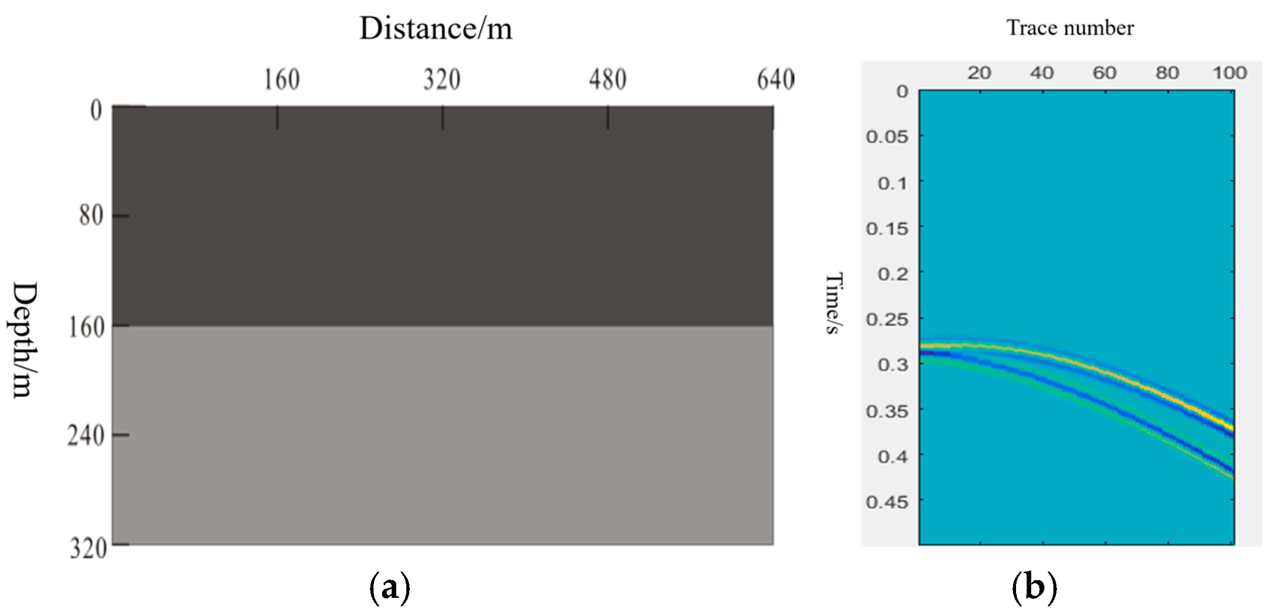 Figure 4. Layered model required for forward modeling and simulated single-shot record (The different colors in (a) represent different strata; In figure (b), the variable density map of the seismic reflection is shown. Warm colors represent high amplitude values).