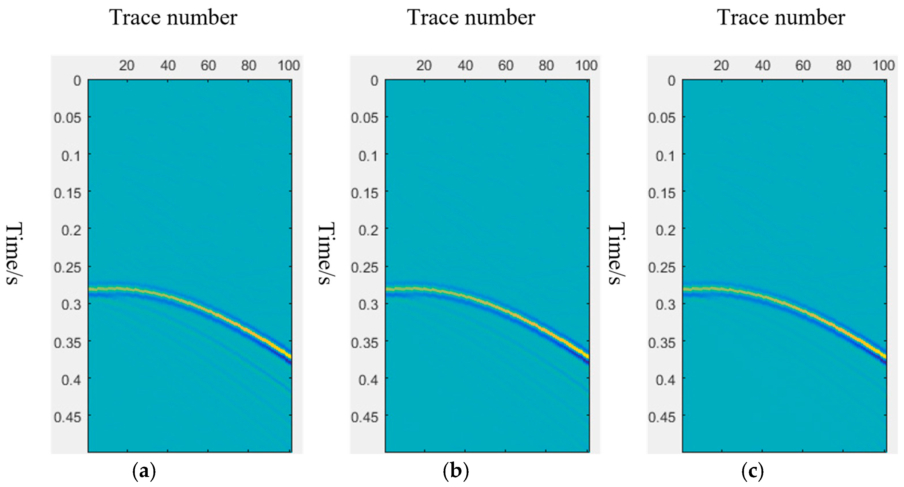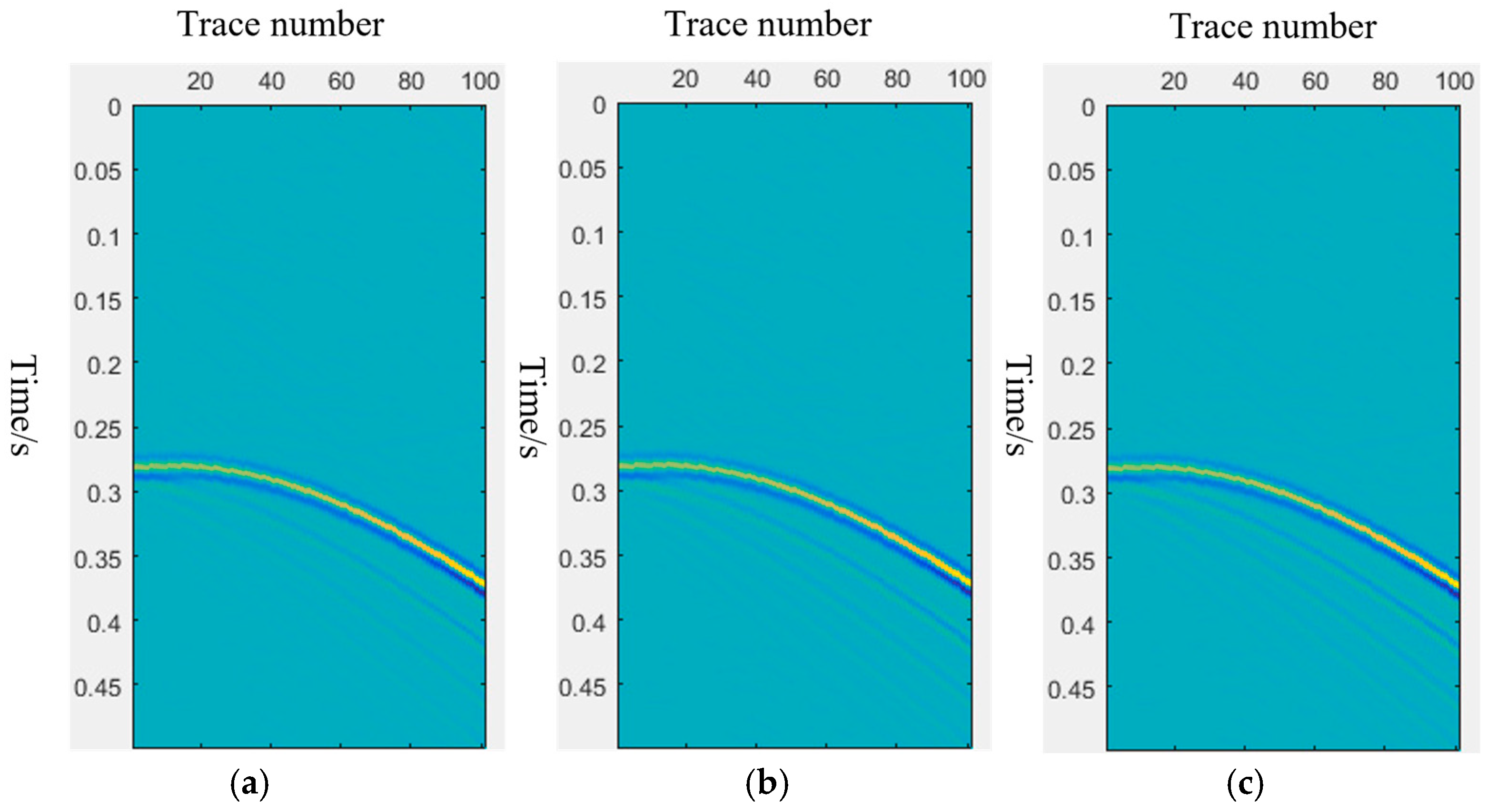 Figure 6. Comparison of ghost wave suppression effects for different regularization methods ((a) DP; (b) UPRE; (c) GCV. The variable density map of the seismic reflection is shown. Warm colors represent high amplitude values).