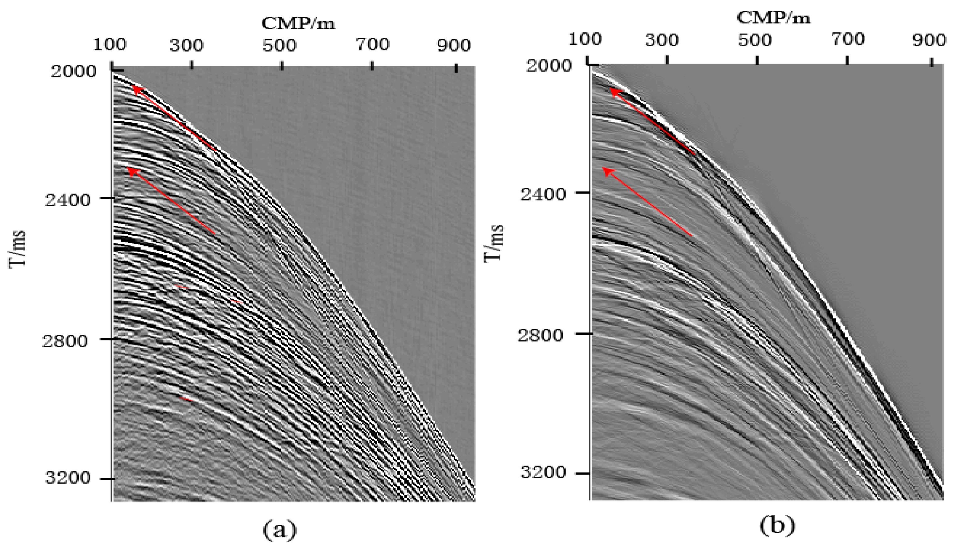 Figure 8. Comparison of a single gun before ghost wave suppression (a) and after ghost wave suppression (b) (The arrows are used to visually demonstrate the differences).