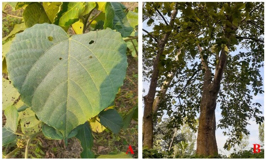 Trewia nudiflora Linn. is a medium-sized Euphorbiaceae tree native to Southeast Asia. T. nudiflora is found in various types of forests, including moist deciduous forests, evergreen forests, and mixed forests (Figure 1) [15]. It tends to thrive in areas with well-drained soils and moderate amounts of rainfall. However, this plant has a long history of use in traditional medicine in various parts of Asia. Some of the medicinal uses of T. nudiflora include curing pain, gout, headaches, toothaches, and menstrual cramps [16,17,18]. Leaves, particularly those obtained through water and ethanol extraction, have been documented to exhibit antioxidant, anti-ulcerogenic, cerebroprotective properties, among others, with no observed phytotoxic effects documented thus far [19,20,21,22]. Therefore, the present study was designed to investigate the herbicidal efficacy of aqueous methanolic leaf extracts of T. nudiflora, as well as to isolate and characterize the responsible phytotoxic compounds for this activity.