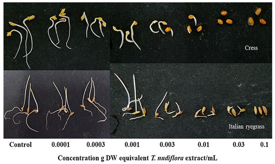 T. nudiflora leaf powder (100 g) underwent an extraction process using aqueous methanol (30:70) for 48 h. The mixture was then filtered using No. 2 filter paper (Toyo Roshi Kaisha Ltd., Tokyo, Japan). A second round of extraction was performed using methanol for 24 h, followed by filtration. The yielded crude extract was the amalgamation of filtrates that evaporated at 40 °C. This extract was solubilized in MeOH to create seven different treatment concentrations (0.0001, 0.0003, 0.001, 0.003, 0.01, 0.03, and 0.1 g DW equivalent T. nudiflora extract in mL−1). The prepared aliquots were applied to a 28 mm Petri plates and dried in a flow chamber. Each of them contained ten sprouts of Italian ryegrass, which had been sprouted at 25 °C for 48 h, and ten alfalfa seeds. These seeds were hydrated with 600 µL of a solution containing Tween 20 (0.05% v/v), and there was a control group treated with 0.05% Tween 20 only. The Petri plates were placed under controlled growth conditions (25 °C in the dark) for 48 h. Following this growth period, the lengths of both the root and shoot of the tested plants were measured to assess the growth-retarding effects of T. nudiflora in comparison to the control group.