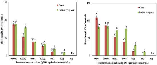 Effects of seven different hydro-methanolic extracts concentrations of T. nudiflora leaves on the growth (root and shoot) of cress and Italian ryegrass. Values are means ± SEs of three replications (n = 60), and the bars represent the mean SE. Significance in differences between treatment and control groups was indicated by distinct alphabetical lettering, determined using Tukey’s HSD test (p ≤ 0.05).