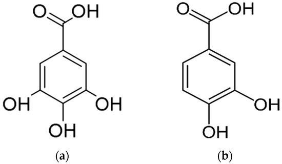 The molecular structure of identified protocatechuic acid (a) and gallic acid (b).