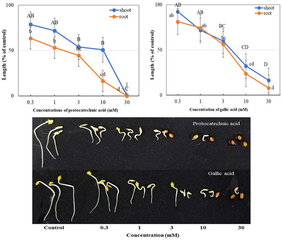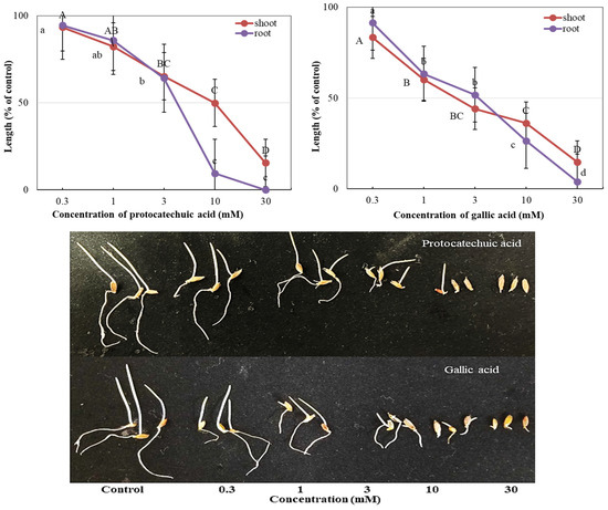 Effects of protocatechuic acid and gallic acid treatment on cress growth (root and shoot). Values are means ± SEs of three replications (n = 30), and the bars represent the mean SE. Significance in differences between treatment and control groups depicted by distinct alphabetical lettering (Tukey’s HSD at p ≤ 0.05).