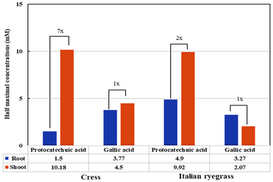 The effects of protocatechuic and gallic acids on plant growth were evaluated by examining their phytotoxicity toward cress and Italian ryegrass (Figure 5 and Figure 6). Significant cress root growth inhibition was noted at concentrations of 0.3 mM of protocatechuic acid and 3 mM of gallic acid, respectively, while shoot growth inhibition was observed with 3 mM of both compounds (p ≤ 0.05). At a dosage of 10 mM, protocatechuic acid decreased cress root and shoot by 83.5 and 49.2%, respectively, but gallic acid inhibited them by 76.4 and 67.8%, respectively. At the highest concentration (30 mM), protocatechuic acid completely inhibited cress growth; in contrast, gallic acid inhibited root and shoot growth by 92.1 and 83.6%, respectively. In the case of Italian ryegrass, significant growth inhibition was observed at 3 mM of protocatechuic acid, whereas gallic acid significantly arrested Italian ryegrass root and shoot growth at a concentration of 1 mM. With a dosage of 10 mM, protocatechuic acid restrained Italian ryegrass root and shoot by 90.5 and 50.1%, while gallic acid inhibited it by 73.5 and 63.7%, respectively. At the highest concentration (30 mM), protocatechuic acid completely stopped Italian ryegrass root growth, and shoot growth was reduced to 84.5% of the control. Gallic acid inhibited root and shoot growth by 96 and 85.2%, respectively, with the same concentration. The 50% growth reduction of the two plants was achieved with 2.07–4.50 mM of gallic acid and 1.50–10.18 mM of protocatechuic acid. These results suggest that the plants were more responsive to gallic acid than to protocatechuic acid (Table 2) (Figure 7).