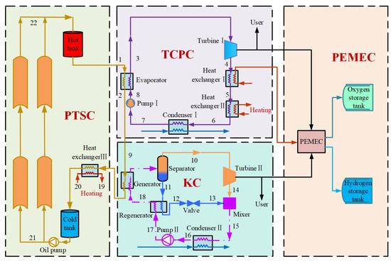 In hydrogen production, water electrolysis is one of the most suitable technologies for producing clean hydrogen, which was developed in the 18th century [6]. Using renewable energy to power electrolyzers for hydrogen production coupled with waste heat utilization effectively supports country energy conservation and carbon emission reduction goals. Solar collection system combined with transcritical CO2 power cycles (TCPC) can efficiently absorb and convert solar energy [7] to generate power and heat, which can directly drive the electrolyzer for hydrogen production. For low-temperature heat recovery, Kalina cycle (KC) exhibits the feature of boiling ammonia–water mixture under temperature variation compared to the pure mass circulation system, which can effectively reduce the losses caused by the heat transfer temperature difference in the evaporator and condenser to improve system efficiency and to match the low and medium temperature heat sources [8]. Yu et al. [9] proposed a novel geothermal energy recovery combining KC and TCPC, developing a thermodynamic model and optimizing system performance. Results indicated that the novel system significantly improved geothermal water, achieving a net power output of 2808 kW.