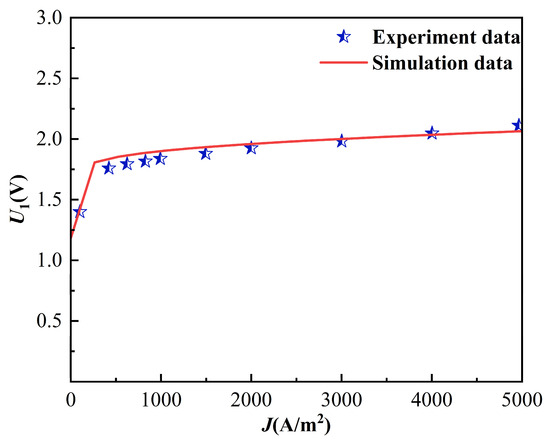 In this study, with reference to the experimental data published in the literature [26], the variation curve of the PEMEC voltage U1 with the current density Jpem was verified at an operating temperature of 353 K, ambient temperature, and ambient pressure of 293.15 K and 101.325 kPa, respectively. As shown in Figure 2, when the PEMEC current density ranges from 0 to 5000 A/m2, the trend and value of the PEMEC unit voltage changes closely with the experimental results, and the maximum calculation error of the simulation compared with the experimental data is 4.49% and the average error is 2.68%.