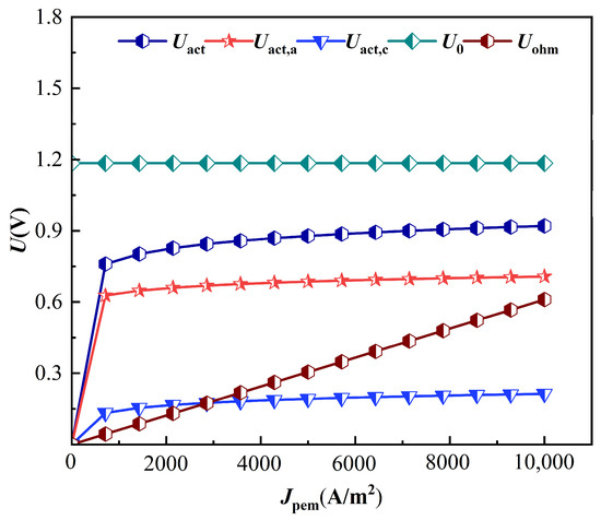where Uohm represents the ohmic loss voltage, V; Uact,a and Uact,c are the anode and cathode polarization voltages, V. These voltages are expressed by
