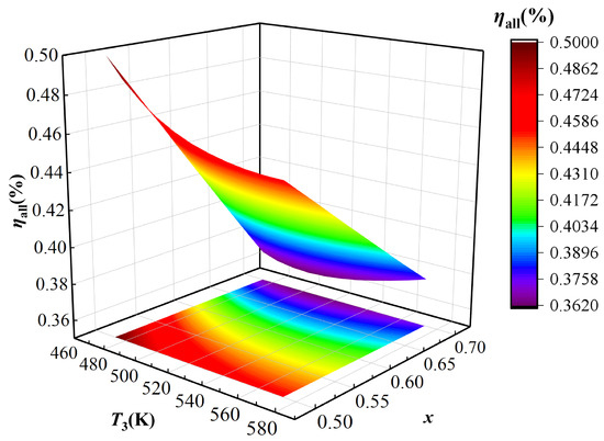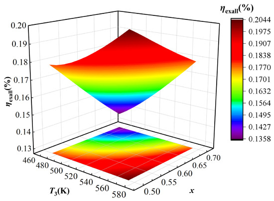 The effects of TCPC evaporator outlet temperature T3 and the basic ammonia solution concentration x of KC on the energy and the exergy efficiency of the IES are shown in Figure 5 and Figure 6. As shown in Figure 5, with the increase of T3, the energy efficiency of the IES continuously decreases when x is less than 0.54, and the energy efficiency of the IES first decreases and then increases when the basic ammonia solution concentration x is greater than 0.54. When T3 increases, the heat absorption of the PTSC increases, then the input heat of the IES increases; when T3 increases, the temperature of supercritical CO2 entering turbine I increases so it leads to the increase in the power generation of turbine I and TCPC, and the power output and hydrogen production of the IES increases. When x < 0.54, the increase rate of energy output from the IES is lower than the increase rate of energy input. When T3 is kept constant, the energy efficiency of the IES exhibits a consistently decreasing trend with an increasing x. This occurs because, although the power generation of the KC and the hydrogen production of the IES increase slightly, the heat load of the heat exchanger III decreases significantly. As a result, the heat supply decreases more obviously, so the energy efficiency of the IES shows a decreasing trend.
