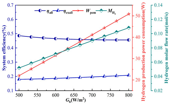 - Solar irradiance (Gb) directly enhances power and hydrogen outputs, but the efficiency trends are similar to those induced by temperature changes.