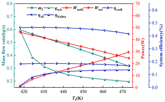 Figure 10 shows the effect of the TCPC evaporator outlet temperature T2 (KC generator inlet) on the IES performance. As T2 increases, the heat absorption of the TCPC evaporator decreases, leading to a reduction in the mass flow rate, and the net external power output of the TCPC decreases, all other conditions being constant. When T2 increases, the heat absorption of the KC generator increases, the enthalpy difference in the ammonia-water solution across the generator increases, causing the mass flow rate of the KC to decrease, but the temperature of the ammonia rich vapor increases, making the net power of the external output of the KC increase and the electrical efficiency of the KC system rise higher. As shown in Figure 10, with an increasing T2, the power generation of the TCPC gradually decreases, while that of the KC gradually increases. Since the power output of the TCPC is larger than KC system, the energy efficiency and the exergy efficiency of the IES show a trend of first increasing and then decreasing, and when T2 = 430.35 K, the energy efficiency and the exergy efficiency of the IES reach the maximum value of 46.52% and 18.62%, respectively, and while it is figured up that the hydrogen production flow rate is of the IES is 0.5136 kg/h.