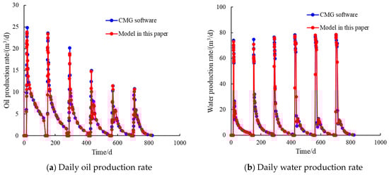 To validate the effectiveness of the model, the simulation results were compared with those obtained from the commercial software CMG 2021, as shown in Figure 1. The figure shows that the initial production rate is high after the soaking period and then declines rapidly. Due to the continuous production of crude oil from the near-wellbore region, the peak production rate of each cycle gradually decreases. To quantitatively assess the matching accuracy, we calculated the Root Mean Square Error (RMSE). This was computed by creating a unified time axis of all output steps from both models over the entire simulation period (0–820 days, 434 total points) and using linear interpolation. The calculation shows an RMSE of 0.26 m3/d for the daily oil rate (Figure 1a), which is a low relative error of ~1.04% of the peak production range (~25 m3/d). The RMSE for the daily water rate (Figure 1b) is 0.80 m3/d, representing a relative error of ~1.00% of its peak range (~80 m3/d). Both low relative errors quantitatively confirm the high consistency between our model and the CMG software.