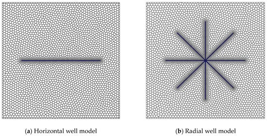 Due to the varying angles of the branch wells, conventional Cartesian or corner-point grids are difficult to use for effective meshing of models containing radial wells, and grid cell cutting can easily occur, leading to non-convergence. Therefore, this study employs PEBI unstructured grids for simulation. This method allows for a static, local refinement to be applied a priori—specifically, within a 10 m radius of the wellbores (horizontal and radial)—to accurately capture near-wellbore physics while minimizing the total cell count. The planar grid discretization results for the horizontal well and radial well scenarios are shown in Figure 2.