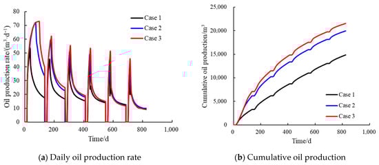 Figure 3 and Figure 4 detail the production dynamics of the three scenarios over six CSS cycles. The figures clearly show that the daily oil and water production curves for all scenarios exhibit a highly consistent cyclical pattern. That is, at the beginning of each production cycle, the production rate rapidly peaks and then quickly declines. Concurrently, as production progresses, the peak production rate of each cycle shows a gradual downward trend, reflecting the general pattern of continuous depletion of reserves and energy in the near-wellbore region during CSS development. Despite the consistent macroscopic trends, there are significant differences in the production benefits of the three scenarios, with the wellbore structure having a notable impact on production rates. In terms of oil production (Figure 3), the dual-layer radial well (Case 3) is the highest, followed by the single-layer radial well (Case 2), and the horizontal well (Case 1) is the lowest. In the first production cycle, the peak oil production for the horizontal well (Case 1) was 53.4 m3/d, while the single-layer radial well (Case 2) and dual-layer radial well (Case 3) reached 72.2 m3/d and 73.0 m3/d, respectively. The peak production of Case 3 in the first cycle was about 36.7% higher than that of Case 1. This advantage accumulates throughout the entire development period. At the end of the simulation, the final cumulative oil production for the horizontal well scenario was 14,872 m3. In comparison, the cumulative oil production for the single-layer radial well scenario reached 19,952 m3, an increase of approximately 34.2%. The best-performing dual-layer radial well scenario achieved a final cumulative oil production of 21,539 m3, an increase of 44.8% compared to the horizontal well scenario and 8.0% compared to the single-layer radial well scenario. The fundamental reason for these data discrepancies lies in the different abilities of the wellbore structures to control the reservoir volume contacted. The advantage of a horizontal well is its contact length, but its affected volume is mainly limited to the area near the single horizontal plane where the wellbore is located. The single-layer radial well improves the uniformity of sweep on the planar level through its multi-directional branches, thus performing better than the horizontal well. The dual-layer radial well, through its three-dimensional layout in the upper and lower layers, has the ability to simultaneously develop the top and bottom of the reservoir, thereby achieving effective development of the entire pay zone thickness.
