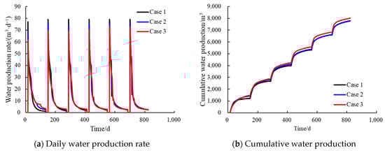 In stark contrast to the significant differences in oil production, the cumulative water production of the three scenarios (Figure 4) is very similar. At the end of the simulation, the cumulative water production for each scenario was around 8000 m3, with relatively small differences. This is mainly because during the CSS process, the produced water is almost entirely condensed water from the injected steam. Since the total amount of steam injected in each cycle is the same for all scenarios, the total amount of water available for backflow is also similar.