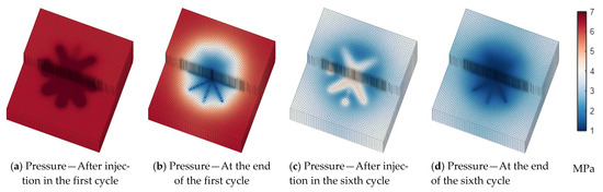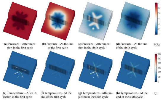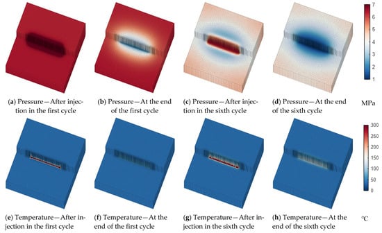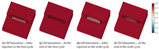 To gain a deeper mechanistic understanding of the fundamental reasons for the differences in production dynamics among the different well type scenarios, a detailed analysis of the evolution of key reservoir physical fields (pressure, temperature, oil saturation) during the simulation process was conducted. Figure 6, Figure 7 and Figure 8 show the distribution of these physical fields for the horizontal well (Case 1), single-layer radial well (Case 2), and dual-layer radial well (Case 3) at four key time points: after steam injection and at the end of production in the first and sixth cycles. To more clearly observe the distribution of physical fields within the reservoir, the single horizontal well and single-layer radial well scenarios are sectioned through the middle of the reservoir, while the dual-layer radial well is sectioned at the level of the lower branch layer near the reservoir bottom.