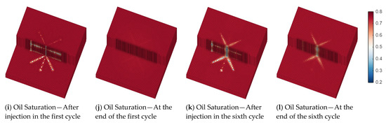There are also significant differences in the temperature and oil saturation fields among the three scenarios. For the horizontal well scenario (Figure 6), its heating and oil displacement range is limited on the planar level. Heat (Figure 6e,g) and the mobilized oil (Figure 6i,k) are consistently confined to a narrow, elongated area around the wellbore. In contrast, for the single-layer radial well scenario (Figure 7), the multiple radial branches allow steam to radiate outwards in all directions, greatly increasing the sweep area and uniformity on the planar level. From the temperature field (Figure 7e,g), it can be seen that a star-shaped heating zone is formed from the very first cycle, which is far superior to the linear heating pattern of the horizontal well. Correspondingly, the decrease in oil saturation (Figure 7i,k) also shows a star-shaped distribution consistent with the heated zone, indicating that oil is effectively mobilized over a broader planar area. The dual-layer radial well scenario achieves maximum reservoir contact and sweep by deploying radial well networks at two levels. This is not merely an expansion on a single plane but the construction of a three-dimensional heating method. It is this more significant reservoir contact and sweep capability that enables it to heat and produce crude oil most efficiently, ultimately manifesting as the fastest pressure decline and the highest cumulative oil productions.