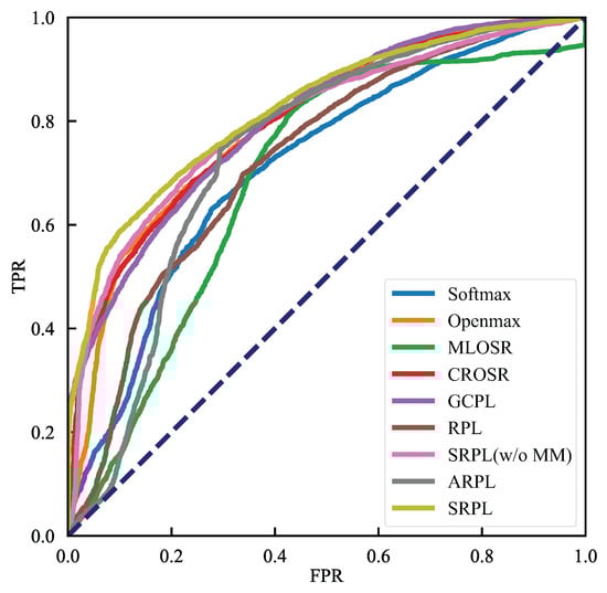 We evaluated our proposed OSFD method SRPL against state-of-the-art algorithms, including discriminative models—threshold-based Softmax, OpenMax [], general convolutional prototype learning (GCPL) [], RPL [], and adversarial RPL (ARPL) []; generative models—multitask OSR (MLOSR) [] and classification-reconstruction OSR (CROSR) []. The experimental results, presented as ROC and OSFDR curves, appear in Figure 5 and Figure 6, and the corresponding metrics AUROC and OSFDR are reported in Table 2. The rightmost column of Table 2 displays the CSFDR, which evaluates the performance of closed-set fault diagnosis using OSFD models, specifically focusing on the CCR at the smallest threshold (). The average CSFDR is approximately 80%, suggesting that when achieves a 75% CCR, the classification ability for known faults is only slightly affected to accommodate the detection of unknown faults. Consequently, the F1-scores at corresponding to a 75% CCR, which are just below 80% (referred to as F1-scores@CCR = 75%), are used to clearly demonstrate the OSFD performance for each known faults and all unknown faults treated as a single class. For SRPL(w/o MM), SRPL, and some competing algorithms such GCPL and RPL, we provide F1-scores@CCR=75% in Table 3. The embedding feature visualizations for these methods are also presented in Figure 7. Noted that, SRPL(w/o MM) refers to SRPL without the incorporation of NSI-based Manifold Mmixup (MM).